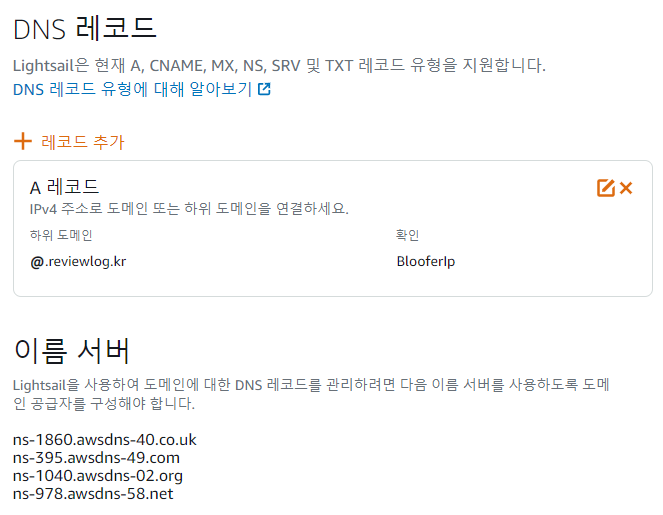이후, Lightsail을 사용하여 도메인에 대한 DNS 레코드를 관리하기 위해 아마존에서 제공하는 네임서버를 사용하여 도메인 정보를 알려야한다.