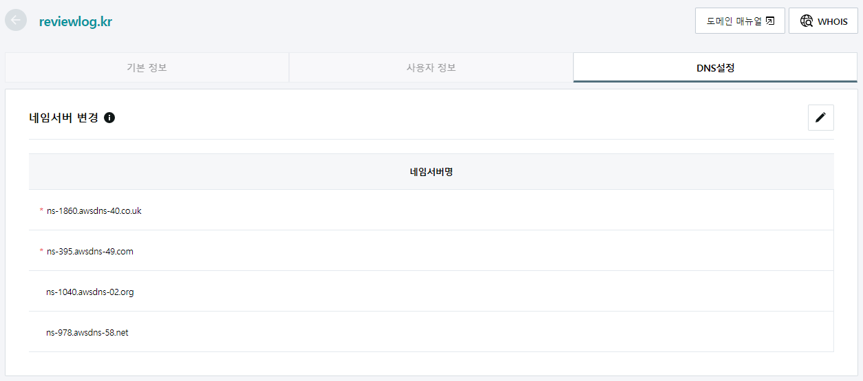 나의 경우 hosting.kr에서 도메인을 구매하여 홈페이지 내 구매한 도메인의 DNS 서버를 아래와 같이 등록하였다.