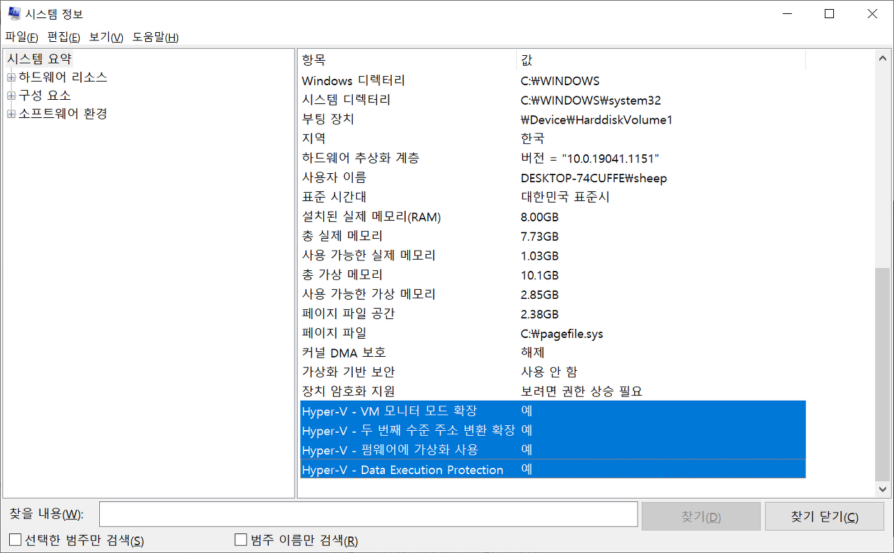 WSL2를 지원하는 윈도우 10 릴리즈 버전인지 확인, Hyper - V 기능을 지원하는 지 확인하자. (시스템정보-시스템요약)