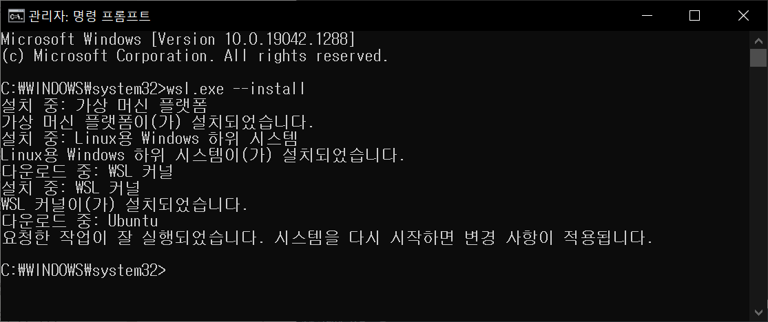 윈도우 프롬프트에서 관리자 모드 실행 후 wsl.exe --install 명령 실행시, 리눅스용 윈도우 하위시스템 설치 명령이 출력되고 설치가 완료된 이후 재부팅 후 wsl 설치 완료된다.