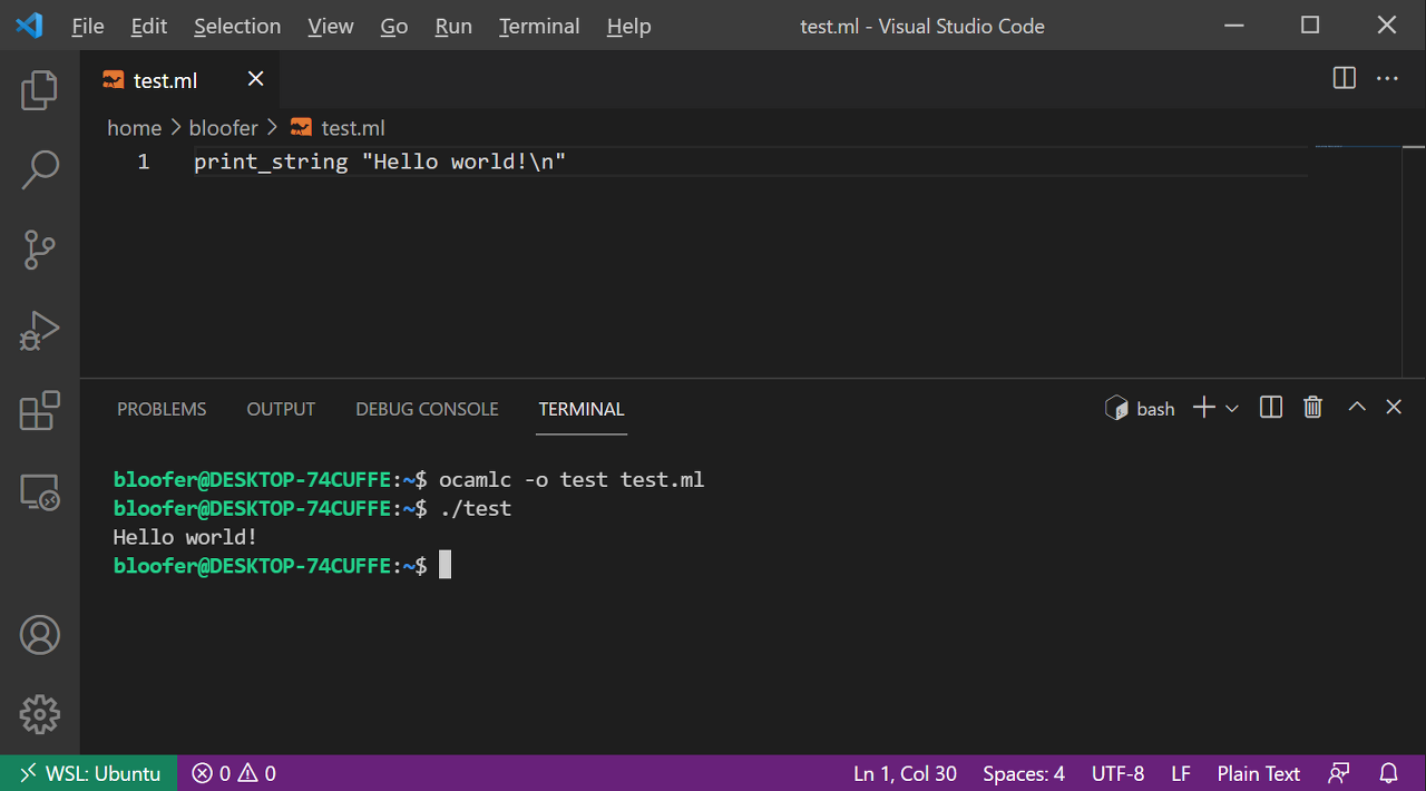 설치된 Remote - WSL을 이용하여 리눅스 어플리케이션을 빌드할 수 있다. 좌측 하단에 보이는 것과 같이 WSL-Ubuntu로 스위치 이후, ocaml hello world를 찍어보았다.