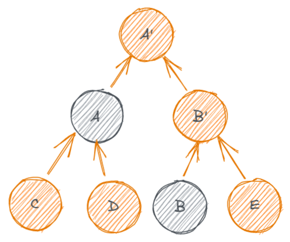 여기서, A', B'는 새로 PQ에 삽입된 A, B의 각각 갱신된 데이터이고 A, B는 따로 삭제되지 않은 채 PQ내에 신규 데이터와 함께 공존한다.