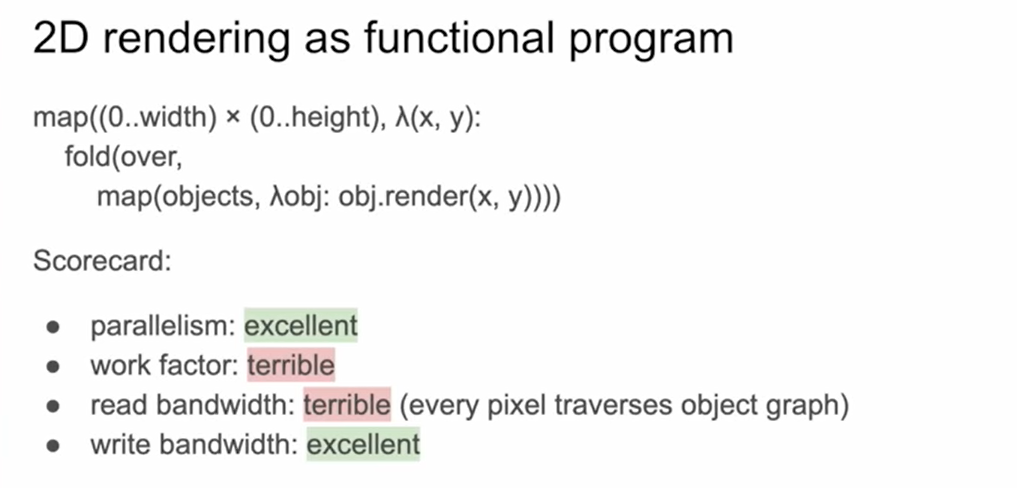 두번째 방식은 sequential하게 이중 for문을 사용하여 렌더링 프로그램을 작성하는 것이다. 그 결과는 이전 함수형 프로그래밍의 정 반대이다. 여기서 프로그램은 완전히 순차적으로 실행되기 때문에 병렬화는 최악이지만, work factor와 read bandwidth는 좋아졌는데, 우리가 오브젝트를 반복문 내에서 단 한번만 읽어오기 때문이다. 단일 스레드 CPU 환경에서는 이러한 방식으로 프로그램을 작성할 수 있다.