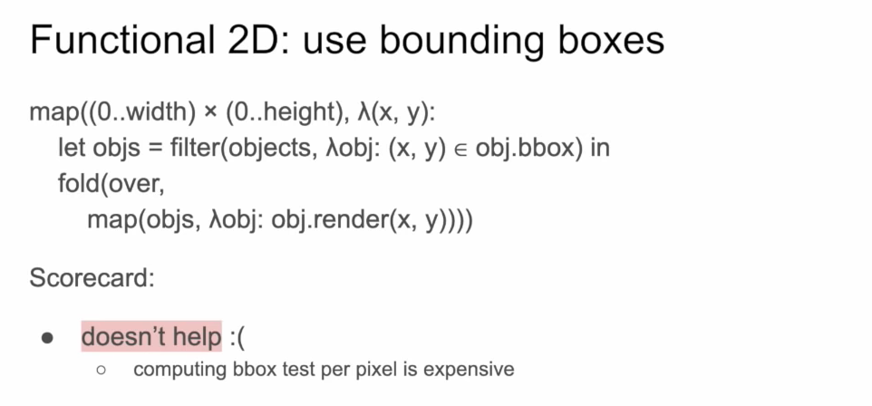 첫번째 방식은 map과 fold를 사용하여 함수형 프로그래밍한 코드 예시이다. 이 코드의 work factor와 read bandwidth는 최악이라고 할 수 있는데, 우리가 읽는 모든 픽셀에서 그림의 모든 오브젝트를 읽어오고 최종 렌더값에 기여되는 값들을 하나하나 계산해야 하기 때문이다. 우리가 관심없는 바운딩 박스 바깥의 픽셀 값은 계산할 필요가 없고, 모든 픽셀에서 오브젝트를 렌더링하는 것이 비싸기 때문에 최적화가 더 필요하다.