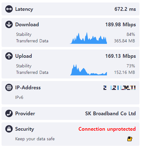 결과적으로 업로드/다운로드 속도는 크게 차이가 없었지만 레이턴시가 거의 10배 가까이 개선된 것을 알 수 있었다.