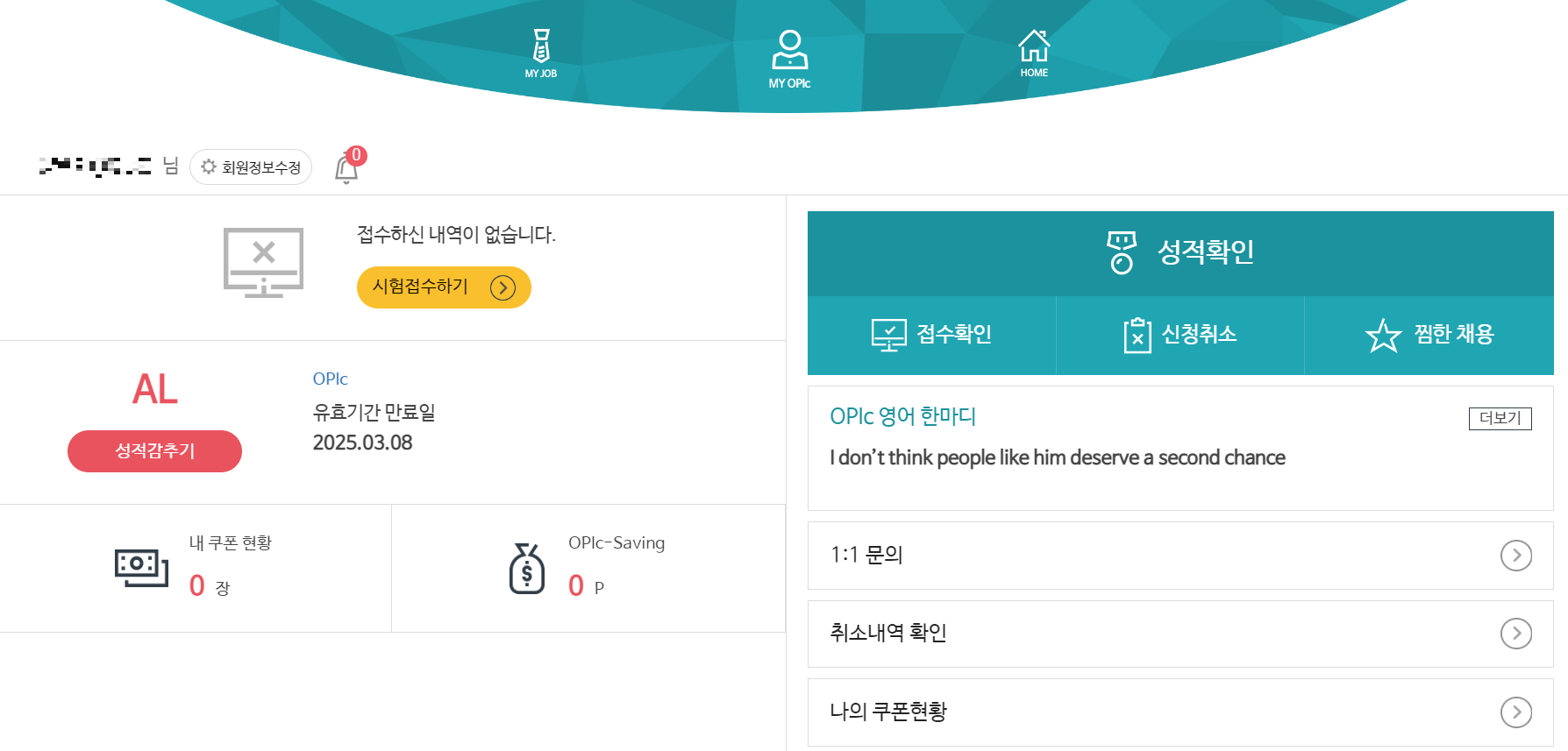 오픽에서 지향하는 시험 의도는 문맥과 상황을 고려한 의사소통 능력과 문법 및 어휘 사용력에 대한 평가인 것 같다. 나는 오픽에서 의도로 하는 이 대부분을 전화영어로 연습할 수 있었다. 전화영어로 실제 회화를 수행하면서 내가 영어로 나의 의사를 전달하는 능력을 키우고 연습할 수 있고, 거기에 더불어 나의 잘못된 문맥 선정 및 문법, 어휘에 대한 교정을 받을 수 있다는 점이 크게 도움이 되었다.
