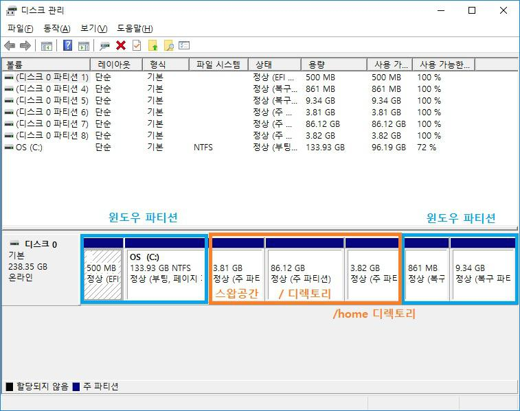 설치 결과(윈도우 10에서의 디스크 파티션 화면)