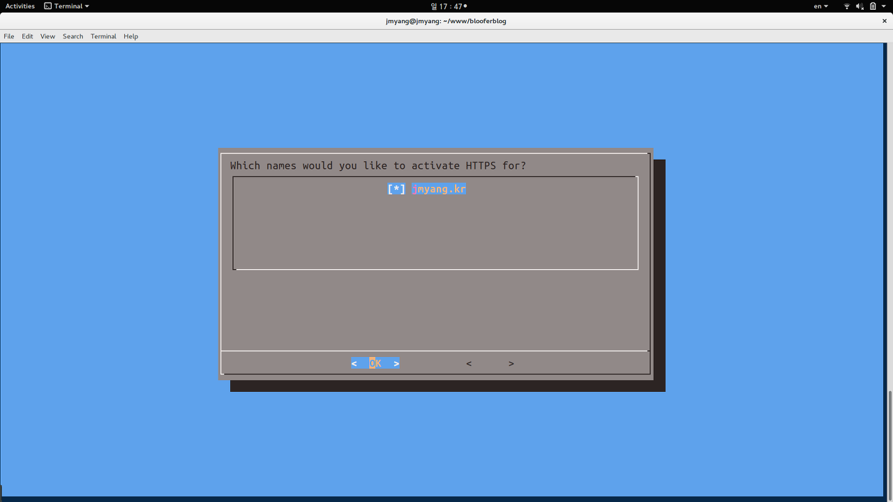 letsencrypt가 실행되면 윈도우95 시절 도스같은 UI의 파란 창이 뜨는데, 거기에 나오는 순서대로 도메인명, 이메일 주소를 등록해주도록 한다.
