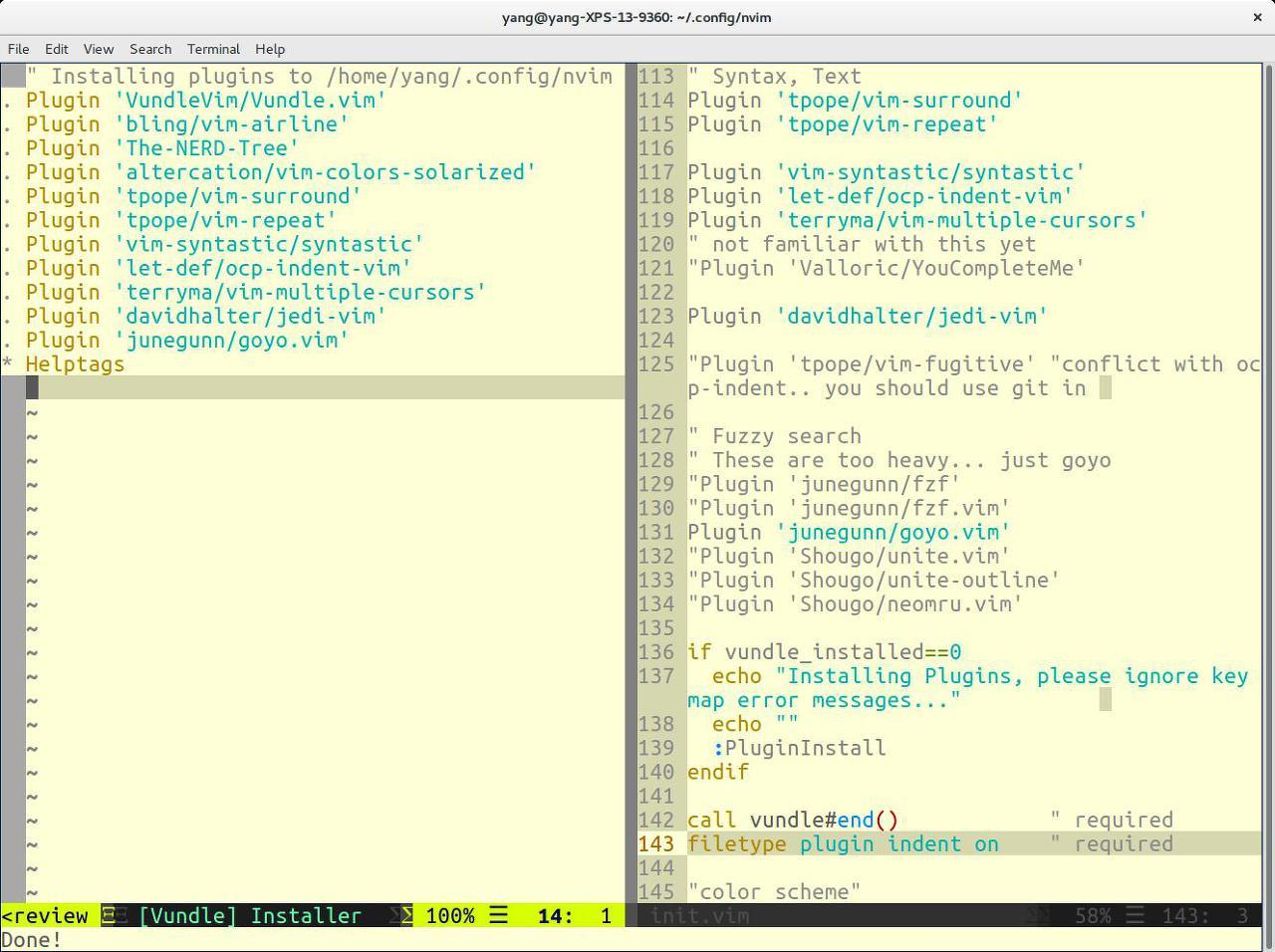 그 외에 Neovim 위에서의 플러그인 설치 과정은 Vundle 패키지 매니저 이용하여 간단하게 이루어진다. Neovim이 제대로 설치되고, 파이썬 설정이 제대로 이루어져있다면, Neovim을 처음 킬 때 init.vim 파일에 따라서 Vundle 패키지 매니저가 자동으로 설치되고 Neovim 안에 들어가서 :VundleInstall후 :VundleUpdate를 해주면 된다.