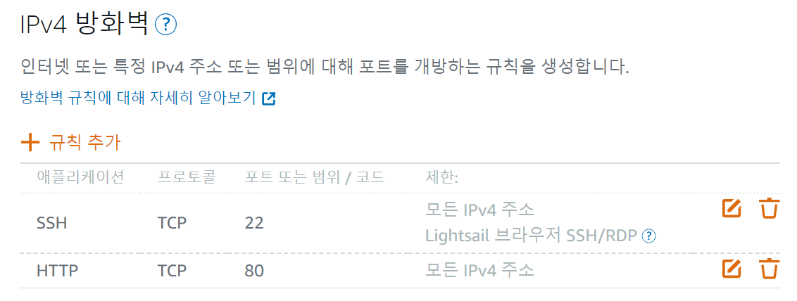 인터넷 또는 특정 IPv4 주소 또는 범위에 대한 포트 개방 규칙을 생성할 수 있는데, SSH는 22번 포트, HTTP는 80번 포트를 지원한다.